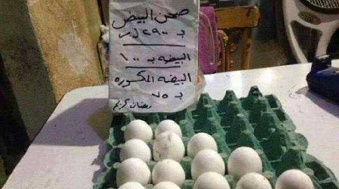 ففوق عبارة رمضان كريم، وضع تاجر مواد غذائية تسعيرة لصحن البيض المؤلف من 30 بيضة محدداً إياها بـ2900 ليرة، أي بما يقارب 96.5 ليرة للبيضة الواحدة، وهو سعر يقل فقط بـحوالي 3.5 ليرات عن سعر البيضة بالمفرق!