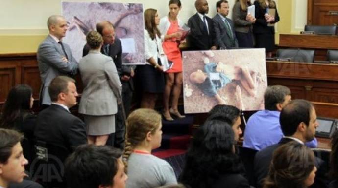 وتم خلال الجلسة استعراض لبعض الصور التي سربها سيزار، منها ما أظهر صوراً لجثث نساء ورجال وشيوخ وأطفال تم تعذيبهم حتى الموت، بعضهم قد تم اقتلاع عينيه وآخرون يظهر عليهم علامات حروق، وبعضها قد تم تجويعها حتى صار يمكن روئية القفص الصدري للضحية.
