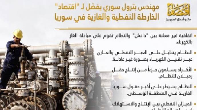 ففي حوار شامل مع مهندس البترول السوري، أحمد فايز المصطفى*، أكد الأخير، بناء على معلومات يمتلكها من الداخل السوري، أن "داعش" تسمح بتدفق الغاز من الحقول الخاضعة لسيطرتها، لصالح النظام، على ألا يقوم الأخير بقطع الكهرباء عن المناطق الخاضعة لسيطرة "داعش".