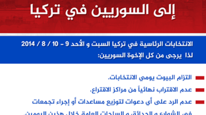 وجّه الائتلاف الوطني لقوى الثورة والمعارضة نداءً إلى السوريين المقيمين في تركيا، طلب فيه منهم التزام البيوت في يومي الانتخابات الرئاسية التركية، وعدم الاقتراب نهائياً من مراكز الاقتراع.