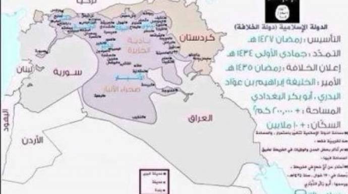 نشرت مواقع تابعة لـ"تنظيم الدولة الإسلامية في العراق والشام"، المعروف باسم "داعش" صورة لخريطة المناطق التي استولت عليها في دولتي العراق وسوريا.