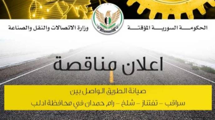أعلنت وزارة الاتصالات والنقل والصناعة في الحكومة السورية المؤقتة عن إجراء مناقصة بالظرف المختوم لمشروع صيانة الطريق الواصل بين سراقب -تفتناز –شلخ –رام حمدان في محافظة إدلب.