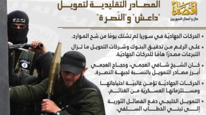 وبخلاف النصرة، لا يوجد أسماء بارزة في الخليج داعمة لتنظيم داعش، كما أن العجمي والذي كان أكبر مصدر للتمويل عبر التبرعات، اتخذ ومنذ تأسيس الدولة الإسلامية في العراق والشام موقفا واضحا ضد تنظيم الدولة، وانحاز إلى النصرة والجبهة الإسلامية في المواجهة التي نشبت بداية العام الماضي. بالمحصلة، ومع ازدياد التضييق على مصادر التبرعات، وادراج الأشخاص على قوائم العقوبات الأوروبية والأميركية، أصبحت التبرعات تشكل جزءا بسيطا من مصادر تمويل التنظيمات الجهادية، ونتيجة لذلك بدأت الحركات الجهادية تعتمد على مصادر غير تقليدية كما سنوضحها لاحقا.
