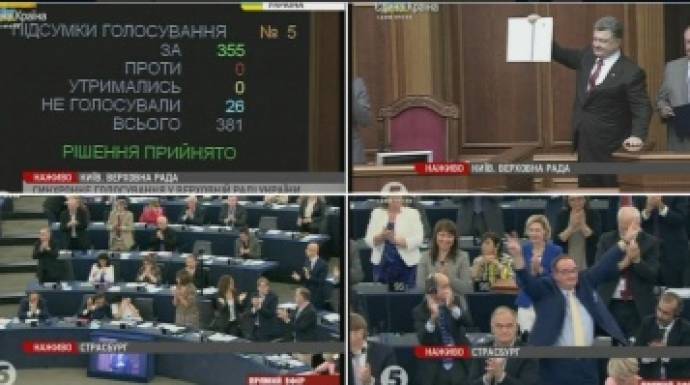 صادق البرلمانان الأوكراني والأوروبي على اتفاقية الشراكة بين أوكرانيا والاتحاد الأوروبي، اليوم في جلستين متزامنتين، انعقدتا في مدينتي كييف الأوكرانية وستراسبوغ الفرنسية.