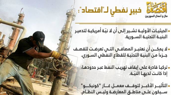 مشيراً إلى رغبة الأمريكيين في المحافظة على هيكل المصافي والمنشآت، لتستفيد منها المعارضة السورية المعتدلة، في حال استلمت الحكم.