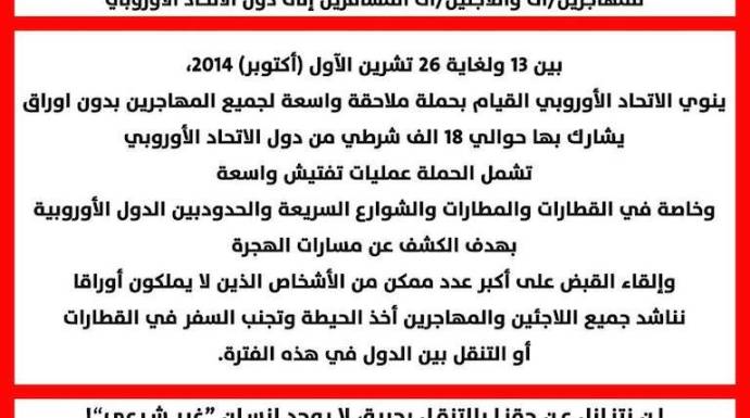 ونشرت الناشطة الحقوقية الفلسطينية المقيمة في برلين "عبير القبطي" نص القرار المتعلق بهذا الإجراء على مدونتها الشخصية نقلاً عن مفوضية الإتحاد وورد فيه أن الاتحاد الأوروبي ينوي القيام بحملة ملاحقة واسعة لجميع المهاجرين بدون أوراق بتاريخ 13 ولغاية 26 تشرين الأول (أكتوبر) 2014. ومن المقرر أن يشارك في هذه الحملة حوالي 18 ألف شرطي من دول (الاتحاد الأوروبي) بهدف إلقاء القبض على أكبر عدد من المهاجرين واللاجئين الذين تعتبرهم أوروبا “غير شرعيين”.