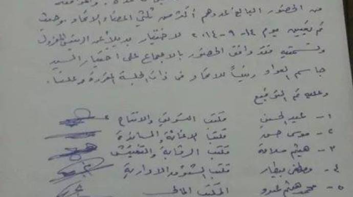 وزوّد النقابي السابق "اقتصاد" بصورة عن محضر اجتماع أعضاء الاتحاد العام لفلاحي الثورة السورية الذي عقد بتاريخ الأحد في 14/ 9/ 2014 وجاء في الإجتماع المذكور: "إقرار أعضاء الاتحاد على بيان مكتب الرقابة والتفتيش والمتضمن إدانة رئيس اتحاد عام فلاحي الثورة السورية (هـ. د) بالاختلاس المالي لرواتب رؤساء ومكاتب الاتحاد، وعدم صرفها لهم والتي قُدمت لهم من منتدى الأعمال برئاسة السيد "غسان هيتو" مع الاستمرار في الاحتكار لأي مبلغ قدم لهم كرواتب لأي جهة في الاتحاد مما يثبت إقدامه مع الإصرار على الاختلاس وإخفاء المال المقدم للاتحاد، وتم في الاجتماع المذكور اتهام رئيس الإتحاد السابق بقيامه منفرداً وبعيداً عن علم واطلاع أعضاء الاتحاد باستلام أسمدة كيماوية عن طريق وزارة الزراعة في الحكومة المؤقتة، وتحويلها إلى الداخل السوري، وبيعها في السوق السوداء، وقبض فوائدها الربحية له شخصياً، وعدم اطلاع المكتب المختصن مكتب الزراعة والإنتاج، حيث كُشفت هذه الصفقة عن طريق الحكومة المؤقتة بعد نشرها على صفحاتها الإعلامية".