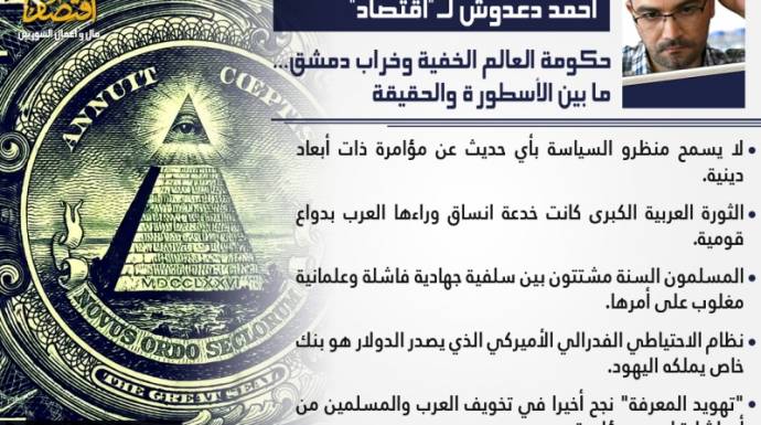قد يكون من العصيب على البعض تقبّل أن ينشر موقع متخصص في الاقتصاد، تقريراً يتناول فيه نظريات وقراءات حول "حكومة العالم الخفية" ونبوءات "خراب دمشق" التوراتية، وأدوار الماسونية، والسلالات العائلية المتحكمة بالاقتصاد العالمي، حيال الحروب والفوضى المدمرة المُعتملة في المنطقة، وخاصة منها، بلدنا سوريا.
