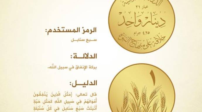 الفئة الأولى: دينار واحد (عيار 21) –تحمل على وجهها الأول شعار "الدولة الإسلامية...خلافة على منهاج النبوة"، وعلى وجهها الثاني سبع سنابل في استدلال من آية قرآنية على "بركة الإنفاق في سبيل الله".