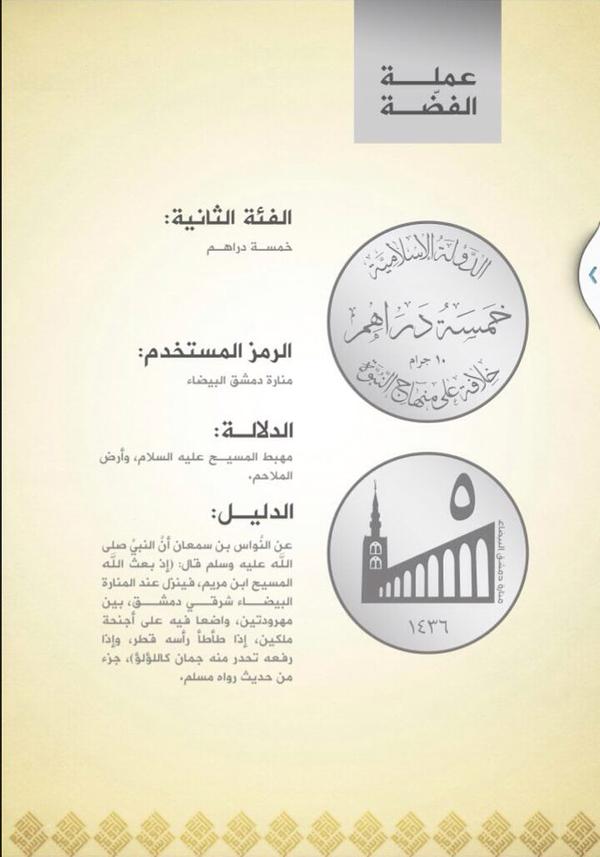 الفئة الثانية: خمسة دراهم –رمزها: منارة دمشق البيضاء في إشارة إلى "نزول المسيح" المُرتقب وكون "الشام أرض الملاحم".
