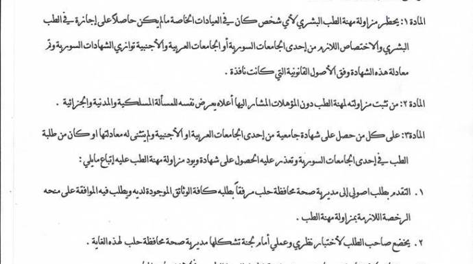 وأوضح التعميم المذكور أن "من تثبت مزاولته لمهنة الطب دون المؤهلات المشار إليها أعلاه يعرض نفسه للمساءلة المسلكية والمدنية والجزائية". وطالب التعميم "كل من حصل على شهادة جامعية من إحدى الجامعات العربية أو الأجنبية ولم يتسنَّ له معادلتها أو كان من طلبة الطب في إحدى الجامعات السورية، وتعذّر عليه الحصول على شهادة، ويود مزاولة مهنة الطب أن يتقدم بطلب أصولي إلى مديرية صحة محافظة حلب، مرفقاً بطلبه كافة الوثائق الموجودة لديه ويطلب فيه الموافقة على منحه الرخصة اللازمة بمزاولة مهنة الطب".