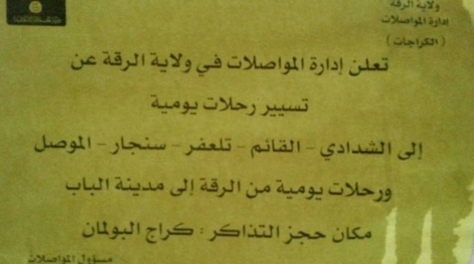 وفي تعميم تداولته صفحات إعلامية تابعة للتنظيم، أعلنت إدارة المواصلات في "ولاية الرقة" عن تسيير رحلات من الرقة إلى كل من المدن المذكورة سابقاً، انطلاقاً من الكراجات في مدينة الرقة.