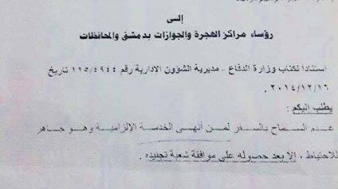 يستمر نظام الأسد بتضييق الخناق على الشبان السوريين في محاولة منه لإقحامهم بقوة السلاح في القتال ضمن صفوفه، حيث أصدر مؤخراً قراراً بدأت بتداوله الصفحات على مواقع التوصل الاجتماعي، منع من خلاله الشبان ممن تراوحت أعمارهم بين الـ 18 سنة إلى 42 سنة من السفر خارج سوريا إلا بعد موافقة رسمية من شعبة التجنيد.