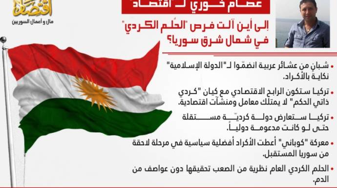 ليست المرة الأولى التي تناقش فيها "اقتصاد" سيناريوهات وفرص تأسيس "دويلة"، أو استقلال ذاتي واسع الصلاحيات، للأكراد، شمال شرق سوريا. لكننا قررنا إعادة فتح الملف ودراسة ما آلت إليه فرص تأسيس هذا الكيان المُفترض في ضوء التطورات الميدانية والسياسية الأخيرة التي طرأت في شمال البلاد، خاصةً لجهة تمدد تنظيم "الدولة الإسلامية"، ومهاجمته لمنطقة عين العرب "كوباني"، التي تحولت إلى "رمز كُردي" في مواجهة "التطرف الإسلامي"، بصورة حظيت بدعم غربي منقطع النظير.