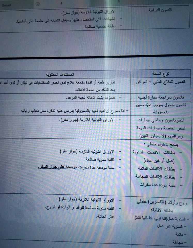 وفيما يلي نص التعميم يوضح تصنيفات دخول السوريين وشروطها والأوراق المطلوبة لها.