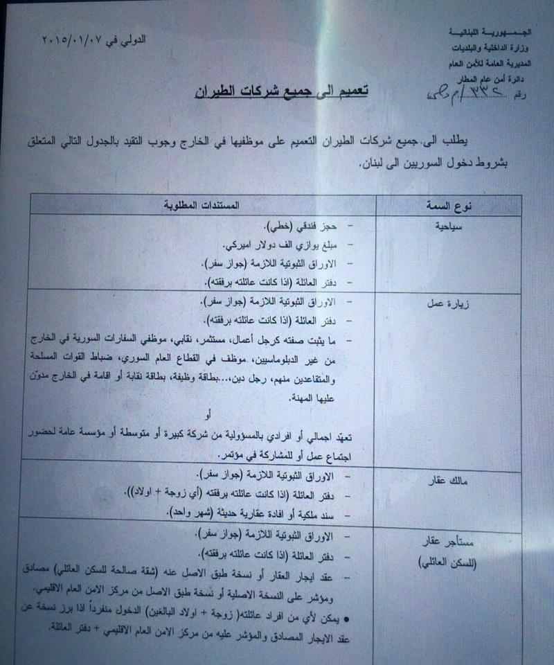 أصدرت مديرية الأمن العام اللبناني تعميماً تم توزيعه على جميع شركات الطيران بخصوص شروط دخول السوريين إلى لبنان عبر المعابر الجوية اللبنانية.