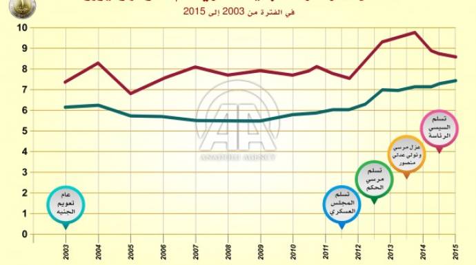وتراجع معدل التضخم السنوي في شهر ديسمبر/ كانون الأول 2014، إلي 9.8% مقابل 12.5% خلال نفس الشهر من العام الماضي، وفق بيانات الجهاز المركزي للتعبئة العامة والإحصاء المصري (حكومي).