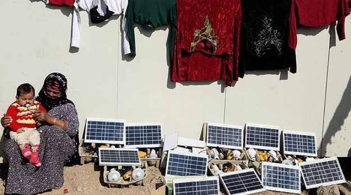 وزعت السلطات في إقليم شمال العراق، ألواح طاقة شمسية، على مخيمات النازحين العراقيين، التي لا يصلها التيار الكهربائي، بعد أن اضطرت السلطات إلى التقنين، إثر سيطرة تنظيم داعش على بعض السدود ومحطات توليد الطاقة الكهربائية في العراق.