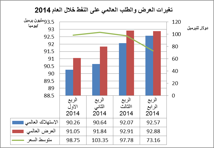 بالمقابل، خلال عام 2014، بلغ متوسط الإنتاج العالمي 92.18 مليون برميل يوميًا ومتوسط الاستهلاك العالمي 91.39 مليون برميل يوميًا، أي إنّ متوسط فائض العرض عن الطلب لكامل عام 2014 هو 790 ألف برميل يوميًا، وعلى الرغم من ذلك، فإنّ متوسط السعر (خام غربي تكساس) للعام نفسه بلغ 93.62 دولارًا للبرميل (وفق إدارة معلومات الطاقة الأميركية). والسبب الرئيس في انخفاض متوسط السعر لعام 2014 عن مستواه عامي 2012 و2013 هو المستوى المنخفض للأسعار الذي سجل في الربع الرابع منه إذ بلغ 73.16 دولارًا للبرميل مقابل 97.78 دولارًا للبرميل في الربع الثالث من العام نفسه.