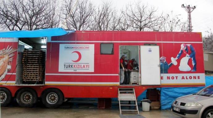 تقدم منظمة الهلال الأحمر التركي 5 آلاف رغيف خبز يوميا تنتجها في فرن متنقل في ولاية "هاطاي" جنوب تركيا، وترسلها إلى تركمان سوريا القاطنين بمنطقة "باير بوجاق" (جبل التركمان)، في ريف اللاذقية شمال غرب سوريا.