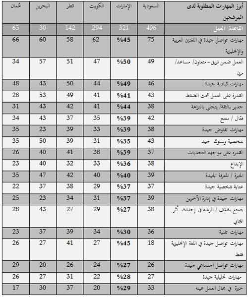 تحظى الشهادات الجامعية وشهادات الدراسات العليا في إدارة الأعمال بالأفضلية لدى شركات المنطقة عندما يتعلق بالمؤهلات الأكاديمية المطلوبة. وفي الإمارات أيضاً، احتلت إدارة الأعمال المرتبة الاولى ضمن قائمة المؤهلات المفضلة لدى الشركات (28%)، تلتها الهندسة (24%) والتجارة (20%). وتبحث الشركات في دولة الإمارات عن مرشحين يتمتعون بمهارات جيدة في العمل ضمن فريق (50%)، ومهارات قيادية جيدة (49%)، ومهارات تواصل جيدة في اللغتين العربية والإنجليزية (45%)، وأن يكونوا جديرين بالثقة ويتحلون بالنزاهة (44%).