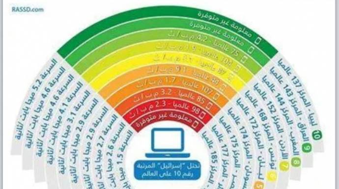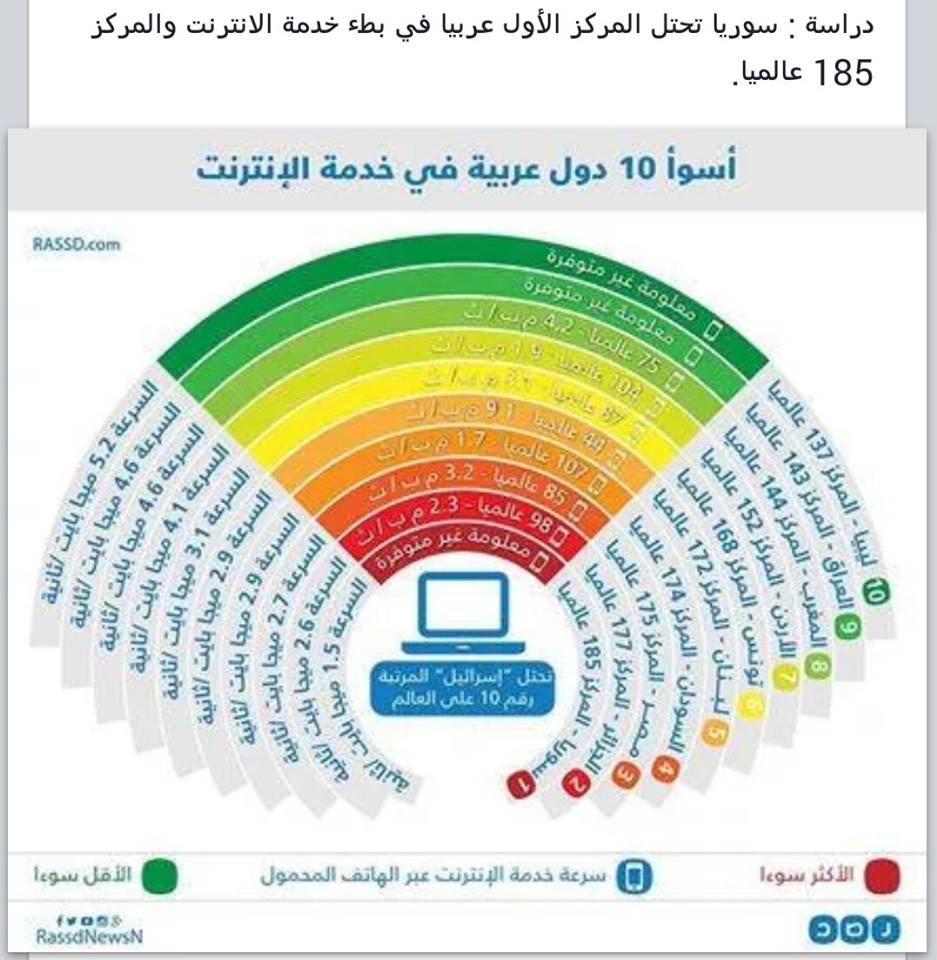 وأعدت "شبكة رصد R N N "، انفوجراف يُظهر الدول العربية العشر الأبطأ في سرعة الانترنيت، وترتيبها، والسرعات المتوافرة فيها، لتكون السرعة بسوريا الأقل عربياً بـ 1.5 ميجابايت بالثانية.
