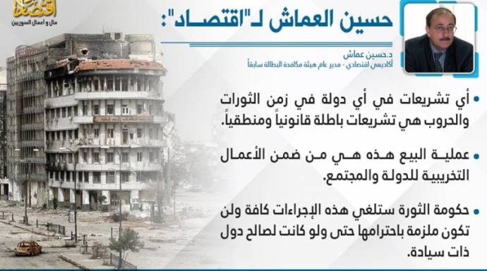 ويعتقد "العماش" أن عملية البيع هذه هي من ضمن الأعمال التخريبية للدولة والمجتمع، وليست تشريعات منطقية لأنه يقصد بها إدامة بقائه ونهب ممتلكات الشعب السوري لتمويل آلته الحربية، وبالتأكيد ما يمارسه النظام من محاولة لإصدار قوانين تجيز له التصرف بالعقارات العامة أو الخاصة وبيعها سواء لأشخاص طبيعيين أو اعتباريين سوريين أو أجانب هي ليست إلا سرقة موصوفة وتدمير للبلد لانعدام النزاهة والمصلحة العامة.