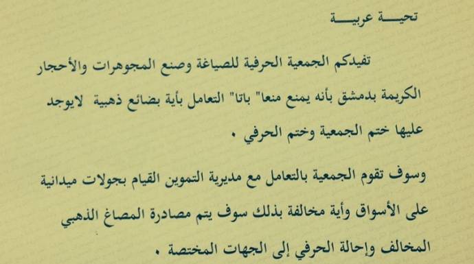 فقد حذرت الجمعية الحرفية للصياغة وصنع المجوهرات بدمشق، في تعميم لها، من التعامل بأية بضائع ذهبية لا يوجد عليها ختم الجمعية وختم الحرفي.