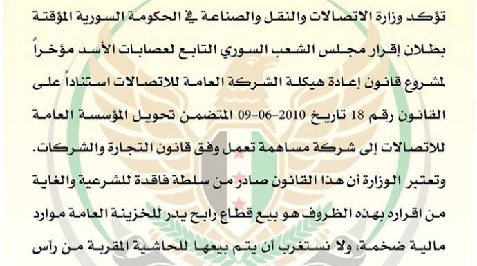 أعلنت وزارة الاتصالات والنقل والصناعة في الحكومة السورية المؤقتة بطلان إقرار مجـلس الشعب السوري التابع لعصابات الأسد مؤخراً لمشروع قانون إعادة هيكلة الشركة العامة للاتصالات استناداً على القانون رقم 18 تاريخ 09-06-2010 المتضمن تحويل المؤسسة العامة للاتصالات إلى شركة مساهمة تعمل وفق قانون التجارة والشركات.