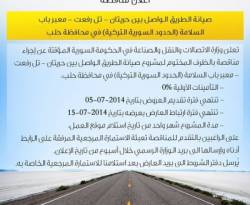 أعلنت وزارة الاتصالات والنقل والصناعة في الحكومة السورية المؤقتة عن إجراء مناقصة بالظرف المختوم لمشروع صيانة الطريق الواصل بين (حريتان - تل رفعت - معبر باب...